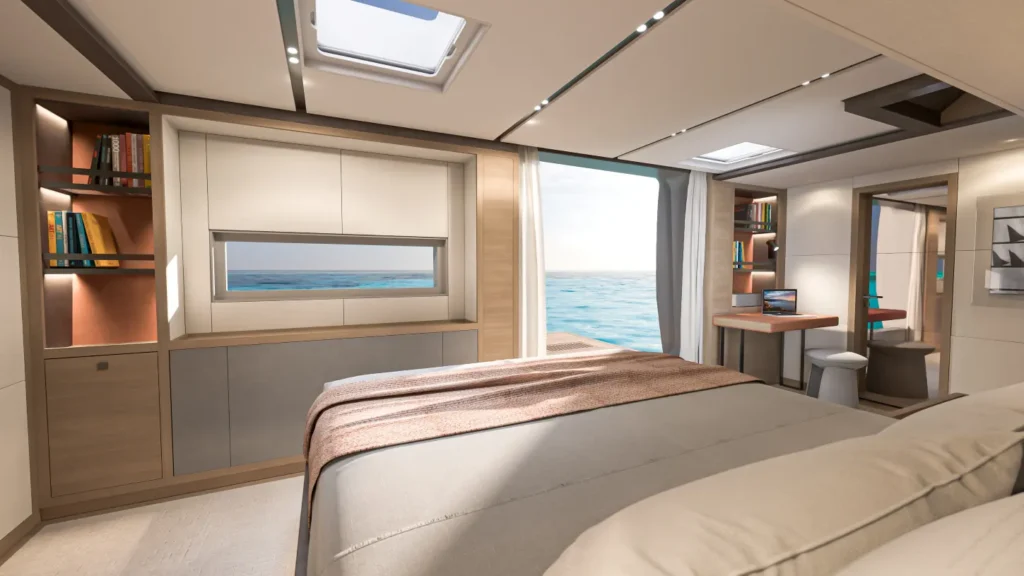 The owner’s cabin features a king-sized berth with a view of the sea, a private terrace, and space for relaxation, designed to offer exceptional comfort.