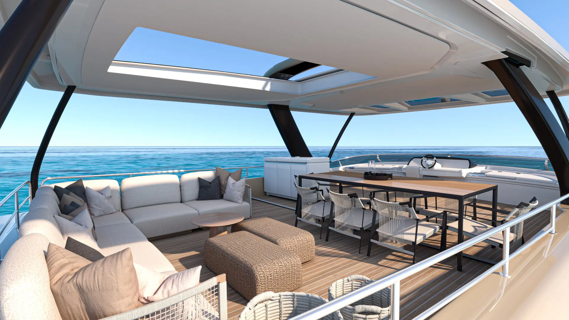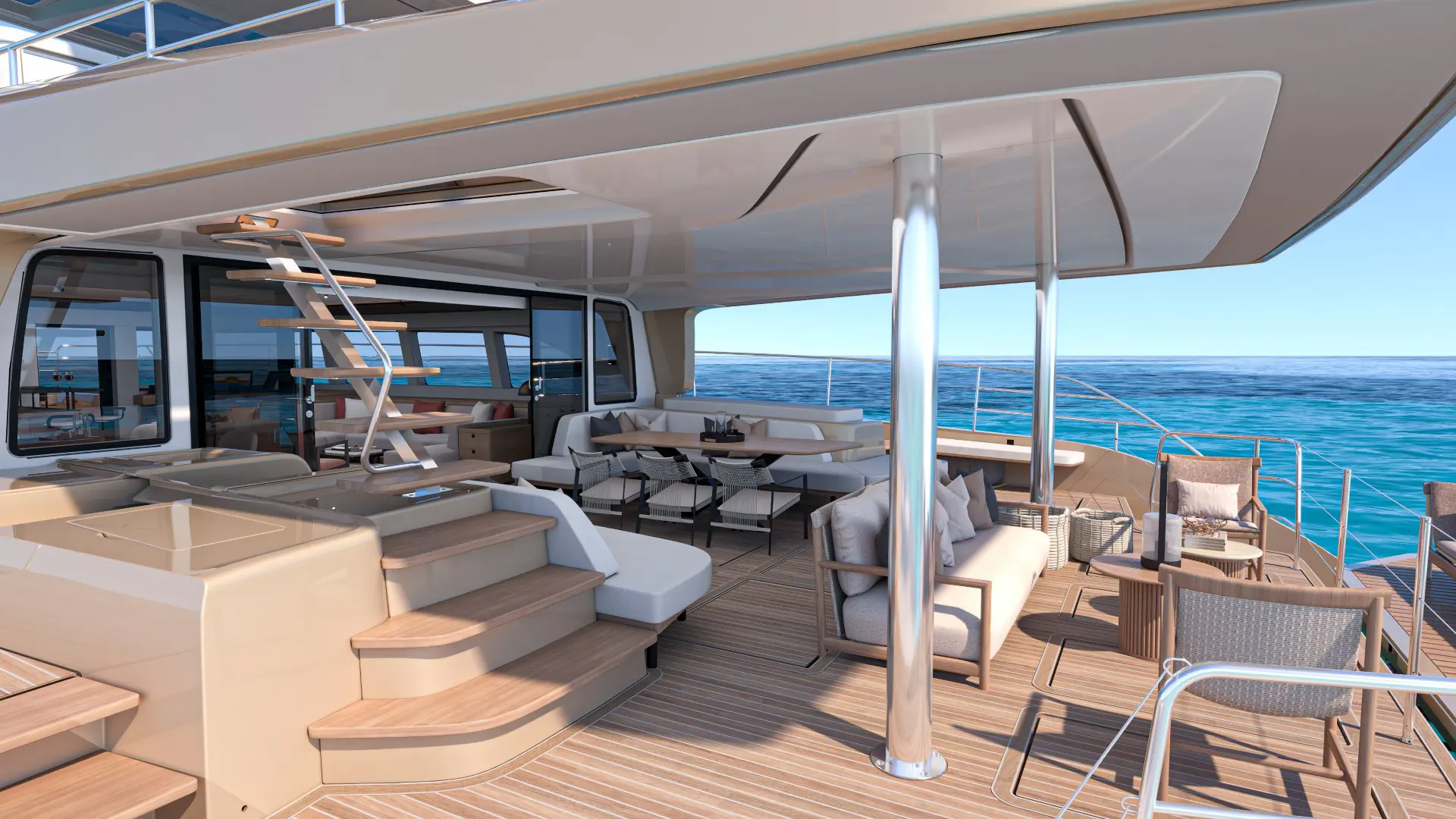 Her design delivers 300 m² of dedicated exterior living space for relaxation, with an aft swim platform extending up to 22 m².