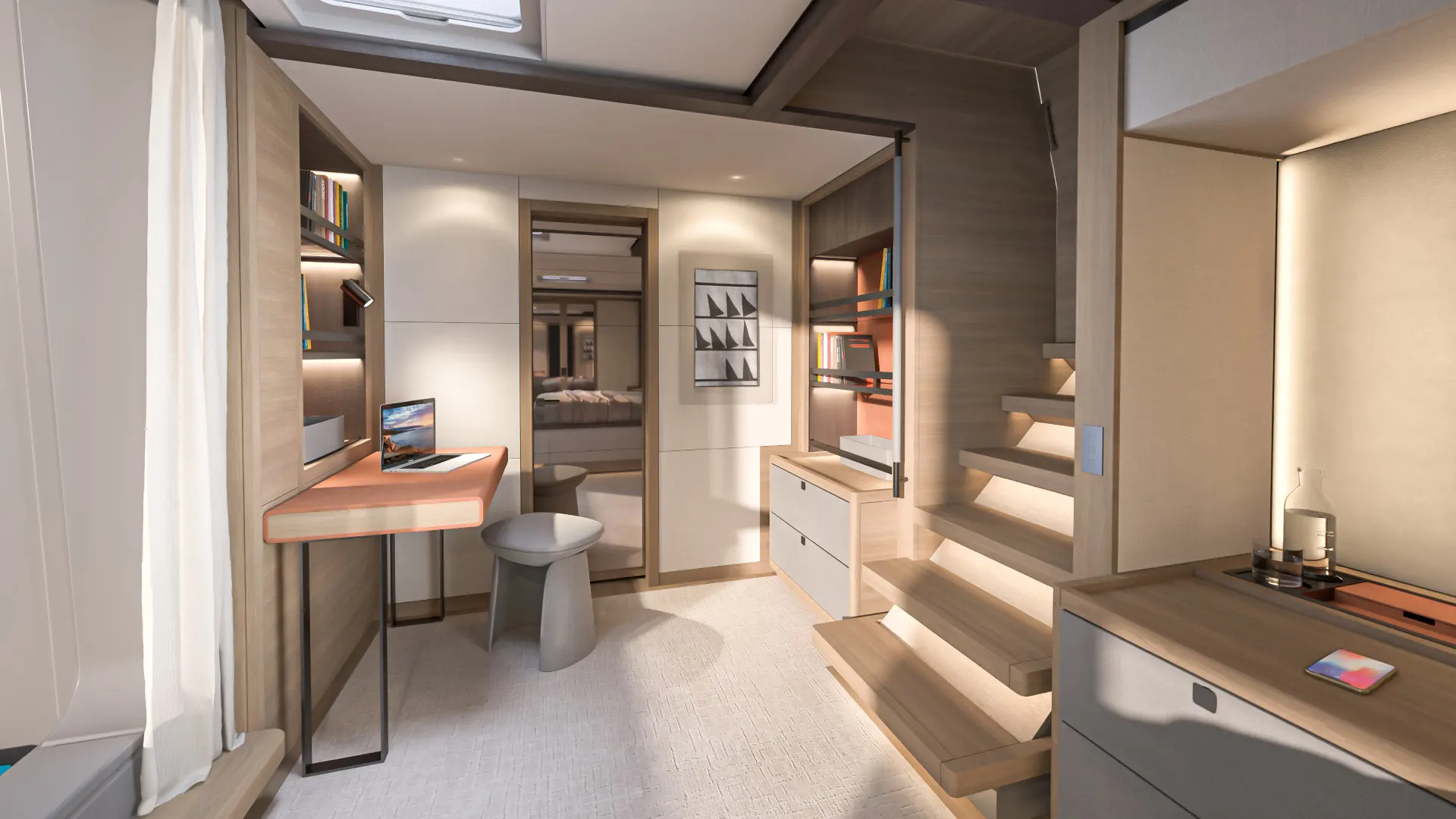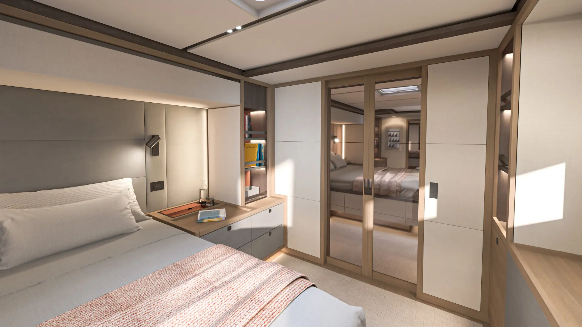 The owner’s cabin features a king-sized berth with a view of the sea, a private terrace, and space for relaxation, designed to offer exceptional comfort.