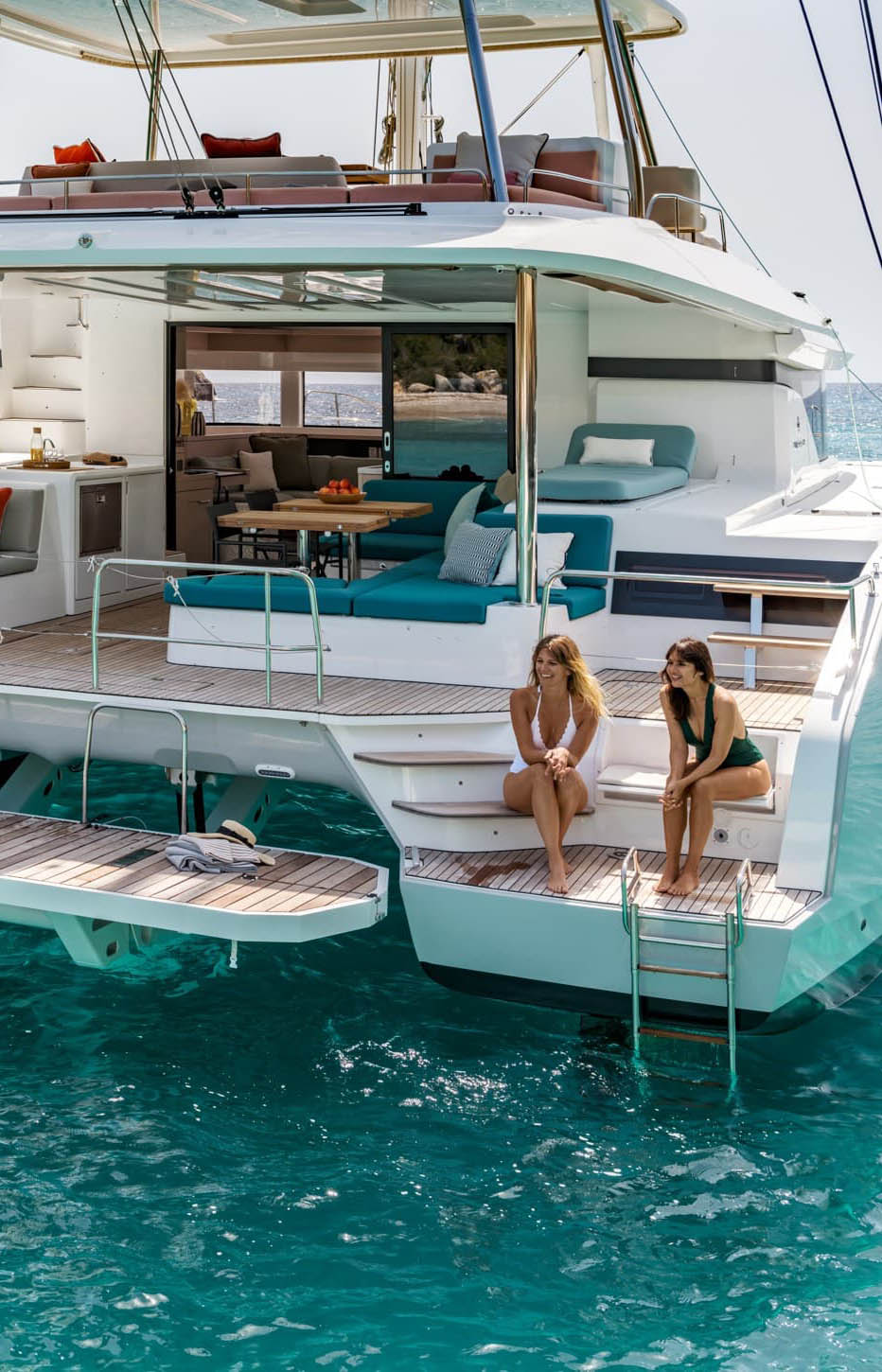 Fundamentalmente para vivir a bordo y hacer grandes travesías, aunque su distribución de 6 camarotes lo convierte también en una máquina de chárter de primer nivel. Dispone de tres mesas para al menos 8 comensales cada una (salón interior, bañera de popa para 12 y flybridge para 10), tres zonas de solarium independientes y plataforma hidráulica de popa. Es el barco con el que cruzar el Atlántico sin renunciar a nada.